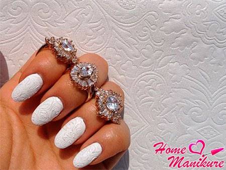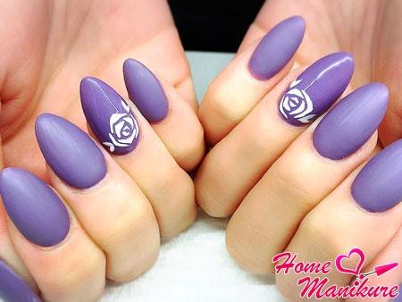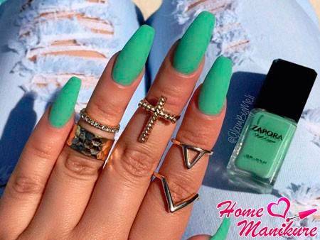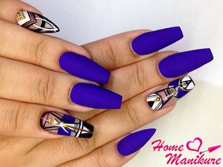 - Матовый маникюр на длинные ногти . С ним дело обстоит ещё проще, ведь матовое покрытие практически не налагает запретов ни на форму ногтевых пластин, ни на их оформление. Такой маникюр можно смело расчерчивать геометрическими узорами, клеить крупные камифубуки, использовать кружевной стемпинг и многое другое.