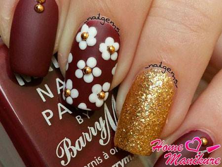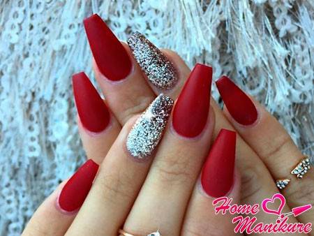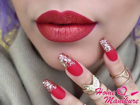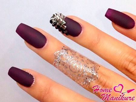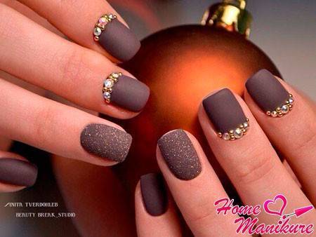 - Стразы . С ними матовый маникюр приобретает нарядность и блеск, поэтому использовать мелкие камешки, а также конфетти, глиттер, кристалы, бульонки и микробисер мастера нейл-арта предлагают без ложной скромности. Всё, что требуется запомнить: украшать следует не более 1-2 ногтей на руке, иначе вместо модной красотки вы превратитесь в новогоднюю ёлку.