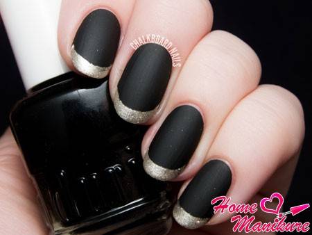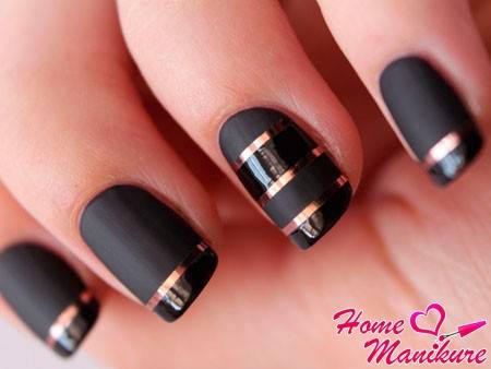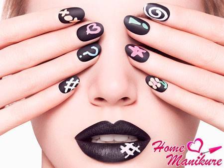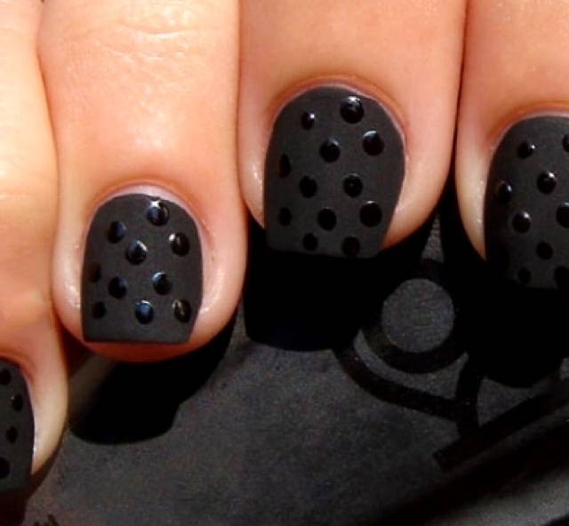 Топ самых популярных дизайнов открывает, конечно же, черный матовый маникюр. За последние годы этот дизайн обрел невероятную популярность. Многие девушки устали от глянцевого блеска и всё чаще отдают свое предпочтение «антиглянцевому» нейл-арту. Черные матовые ногти выглядят очень стильно. Важным достоинством является то, что подобный дизайн крайне универсален и может использоваться в совершенно разных ситуациях.