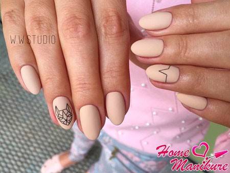 - Матовый маникюр на короткие ногти . Неяркое покрытие отлично ложится на ногти короткой и средней длины, если не пытаться разбавить его обилием дополнительных деталей. Чем сдержаннее будет такой маникюр, тем лучше, поэтому делайте ставку на монохромность, минимализм, минимум декора. Конечно, это не значит, будто коротким ногтям он противопоказан в принципе: тонкие вертикальные линии и полоски, пара некрупных стразов, миниатюрный рисунок на одном из ногтей, выделенные лунки или украшенный кристаллами Пикси мизинец будут здесь вполне уместны. Главное, не увлечься украшательством.