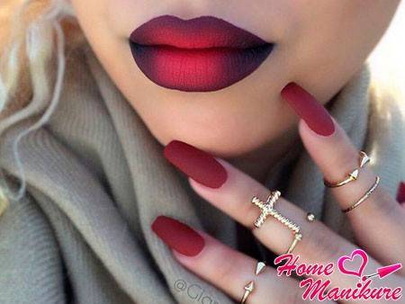 Красный матовый маникюр – романтичный и страстный дизайн. Но, в отличие от глянца, нейл-арт будет более элегантным и не таким кричащим. Если говорить про палитру, то молодые девушки очень любят розовый и малиновый цвет, а женщины постарше отдают предпочтение винным оттенкам вишневого и бордового матового маникюра. Взгляните на фото, как стильно смотрятся красные, бордовые и розовые дизайны ногтей.