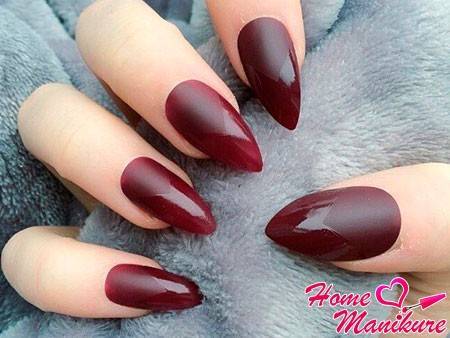 - Омбре и градиент . Растяжку цвета производят так же, как с глянцевыми лаками: от тёмного к светлому или от светлого к тёмному, оттенками одного спектра цветового круга или игрой на контрасте, с декоративными деталями или без них. Можно сказать, что матовый маникюр не накладывает на омбре никаких существенных ограничений, позволяя модницам творить в своё удовольствие.