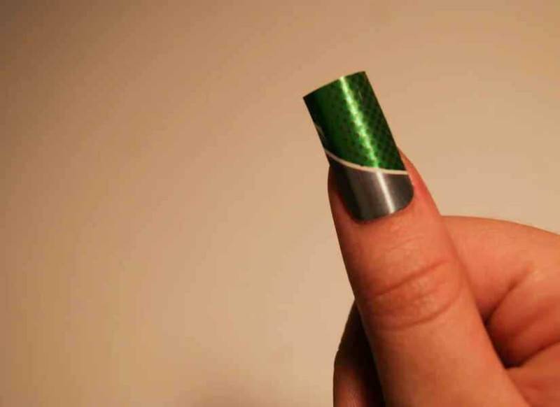 Решите, какую часть вы можете нанести себе на ногти. Мне легче разрезать полоску, достаточно широкую, чтобы она соответствовала длине конечного ногтя, а затем нарезать ее на маленькие кусочки, которые соответствуют ширине моего ногтя. Вам не обязательно разрезать его большими полосами, вы можете выбрать случайную красивую часть и сделать из нее ноготь. Просто убедитесь, что он достаточно большой, чтобы соответствовать вашему ногтю. Далее немного согните об угол стола, чтобы придать естественную форму.