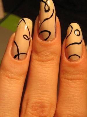 Чтобы сделать случайные линии, понадобится черный лак для ногтей. Наносить их нужно от основания ногтя (это отправная точка). Лака нужно брать немного, чтобы избежать капель и получить линии, а не кляксы. Линии должны быть тонкими, поэтому рисовать лучше всего иглой или очень тонкой кистью. После того как линии нанесены, их необходимо закрепить бесцветным лаком. Рисунок готов.