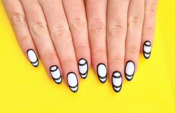 Этот маникюр чем-то напоминает предыдущий, но все же различия есть. Возьмите три лака: основу любого цвета, белый и черный лак. Затем нанесите на ноготь основной цвет и, не дав ему высохнуть, сбоку полукругом нанесите чередующиеся кружочки черным и белым лаком. После этого возьмите иголку и проведите ей от основания ногтя к противоположной стороне полоски, которая соединит эти кружки. Вот так несложно вы можете сделать красивый маникюр. После этого нанесите закрепитель, и он сохранится на ногтях несколько дней.