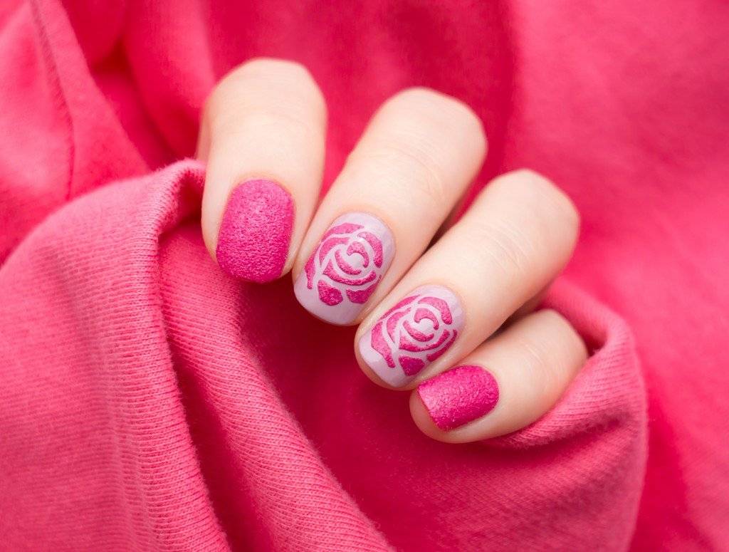 Чтоб придать маникюру эффектную текстуру, используйте акриловую пудру. Такой маникюр очень просто выполнить самостоятельно, при этом много времени не понадобится. Для начала выполните маникюр и нанесите базу. После ее высыхания можно смело покрывать ноготки выбранным оттенком. Затем нанесите акриловую пудру на слой лака и просушите. Остатки стряхните при помощи специальной кисточки. Бархатным песком можно посыпать все ноготки, так ноготки будут выглядеть необычно и изящно. Чтоб сделать более традиционный нейл-арт, покройте акрилом несколько пальчиков, а на остальных нарисуйте узоры тоненькой кисточкой и так же покройте бархатным песком.