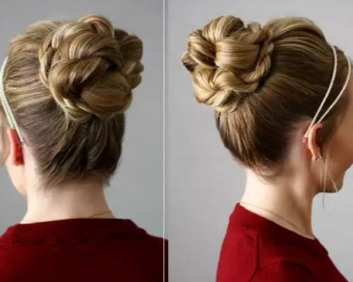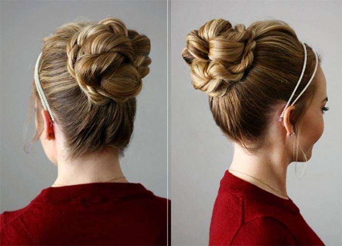 Эту прическу еще называют ракушка. Она смотрится женственно и элегантно. Лучше всего подходит такой пучок на средние волосы.