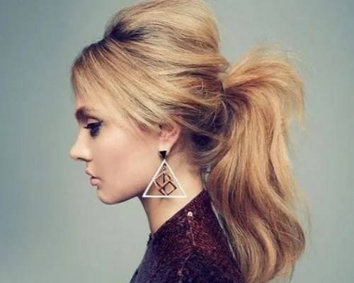 Сегодня очень популярными остаются пышные укладки на основе хвоста. Такого рода прически относятся к ретро-стилю, так как были очень востребованными в 80-х годах. Для создания прически необходимо расчесать волосы, создать прикорневой начес и сделать объемный хвост, расположив его на затылке.