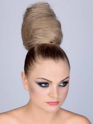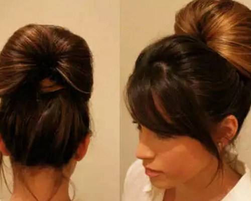 Следует на макушке завязать высокий хвост. Далее мелкой расческой начесать. Потом собрать в пучок при помощи специального объемного бублика или носка.
