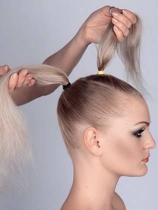 Для начала стоит сделать начес у корней и собрать высокий хвост.