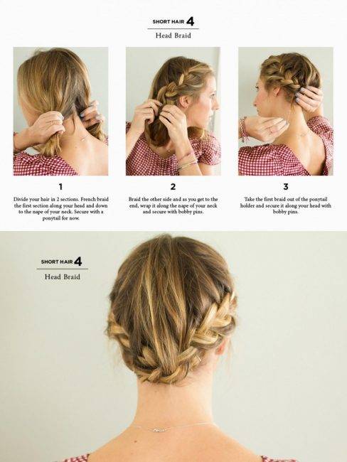 Косы и колоски так само эффектно смотрятся на коротки волосах. Главное – правильно выполнить плетение. Для этого высушите волосы при помощи фена с добавлением мусса или пенки для объема. Затем заплетите 2 французские косы. Зафиксируйте их тонкими резинками. Вытяните немного прядей с кос так, чтобы у вас получились объемные букли. Зафиксируйте лаком. Теперь вы обладательница стильной повседневной укладки.