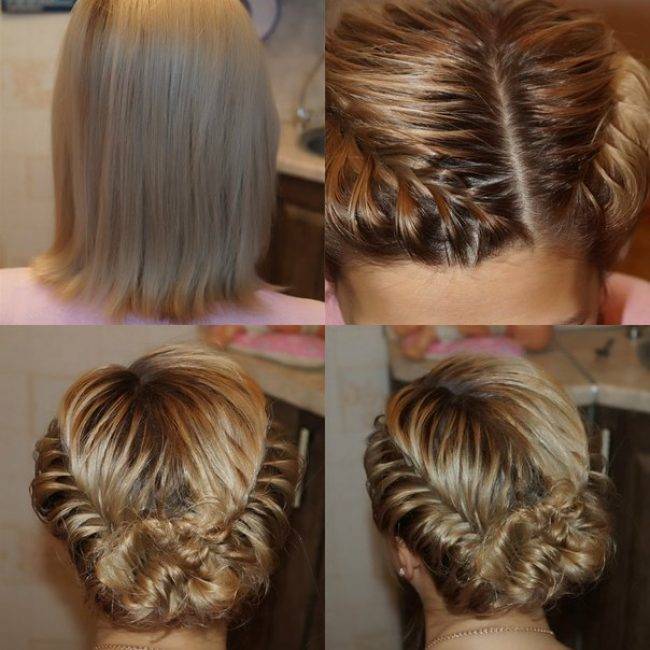 Этот вариант похож на классическую ракушку по объему, но выполняется немного иным способом. Высушите волосы при помощи фена с добавлением мусса или пенки для объема. Затем часть волос с макушки отделите и немного подчешите. После заплетите колосок. Если сбоку будут выпадать пряди – заколите их невидимками. А снизу косичку зафиксируйте кончиками внутрь. Таким образом, у вас получится аккуратно собранная укладка.
