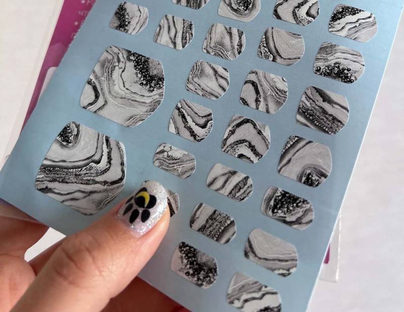 By Provacative nails имеет широкий выбор дизайнов, цена плёнок для педикюра от 520 до 590 рублей на маркетплейсах. В наборе 8 плёнок разного размера для большого пальца и 22 на маленькие пальчики. Удобные для нанесения с ярким принтом, в наборе бумажная линейка для замера ногтевой пластины.