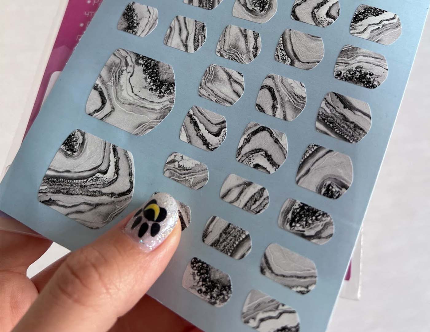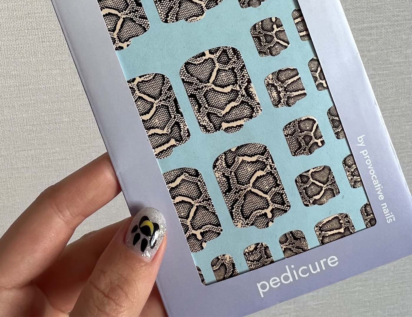 By Provacative nails имеет широкий выбор дизайнов, цена плёнок для педикюра от 520 до 590 рублей на маркетплейсах. В наборе 8 плёнок разного размера для большого пальца и 22 на маленькие пальчики. Удобные для нанесения с ярким принтом, в наборе бумажная линейка для замера ногтевой пластины.