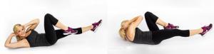 Итак, лёжа на спине, ноги согнуты в коленях, стопы по ширине плеч, упираются в пол. Заводим правую ладонь за голову и отрывая правую лопатку от пола, тянемся локтем к противоположному колену в диагональ. 20–30 повторений на одну сторону, потом на другую.