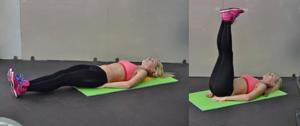 Лёжа на спине, ладони под ягодицами, для предотвращения нагрузки на поясницу. Поясничный отдел плотно прижимается к полу. Ноги прямыми держим внизу, и с выдохом поднимаем обе ноги на угол 90 градусов, а на вдох опускаем. Выполняем 20–30 повторений по 3–4 подхода.