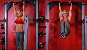 Подъем ног в висе – еще одно упражнение на нижнюю часть (только если есть турник или тренажер).