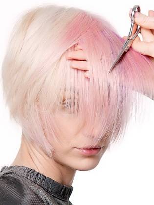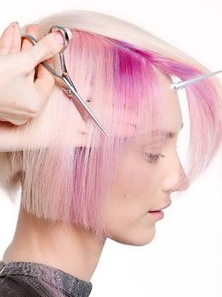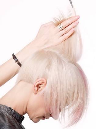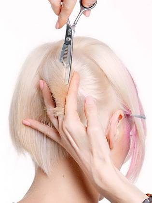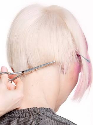 - Зону макушки обрабатываем методом прикорневой филировки для создания объема. Для плавного перехода разных длин друг в друга, а также для создания мягкой текстуры обрабатываем всю массу волос методами пойнтинг и слайсинг.