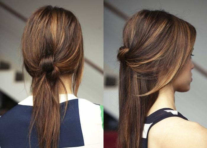 Хвост с узелками. Такая офисная прическа выглядит нежно, женственно. На чистые локоны нанесите пенку, мусс. Пряди соберите так, словно думаете делать боковой нижний хвост. Разделите их на 2 одинаковые части, завяжите в узел, следом в еще один. Зафиксируйте резинкой. Расправьте прядки, по желанию нанесите немного пенки и взбейте концы хвоста, придавая объема.