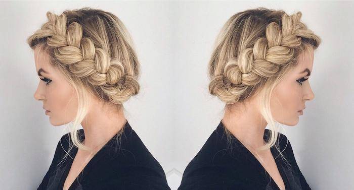 На коротких волосах можно позволить себе даже заплести косу. Прическа подойдет для тех типов коротких стрижек, у которых верхние пряди спереди длиннее, чем сзади. Надо вымыть голову и нанести мусс, высушить волосы необходимо феном, чтобы расческой придать небольшой объем. Далее пряди сбрызгиваются лаком, для лучшего эффекта. Затем плетётся коса по верхней части головы от одного виска к другому, как ободок, с вплетением некоторых прядок из длины. Можно плетение осуществлять и по боковой линии до уха. Волосы, которые вылезут из прически можно пригладить с помощью лака. Не стоит делать так, чтобы пряди за косой были сильно приникшими к голове, лучше их немного взлохматить. Получилась немного хулиганская и в тоже время женственная и, главное, простая прическа на короткие волосы.