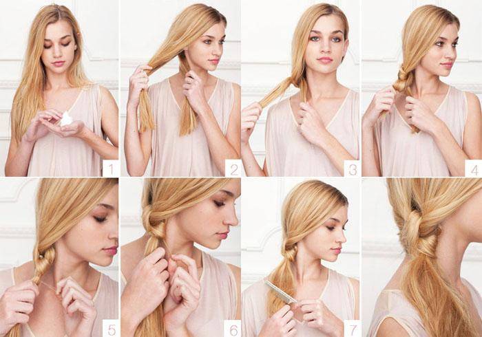 Для начала необходимо помыть голову и на чуть влажные, непросохшие пряди нанести мусс и распределить его с помощью расчески. Дальше надо собрать волосы в хвост на затылке. Если какие-нибудь короткие пряди выпадают из хвоста, можно их замаскировать под плетение косички.