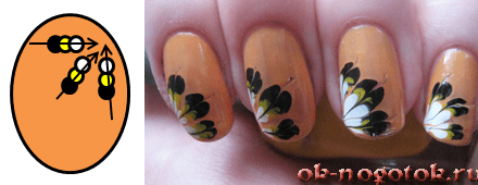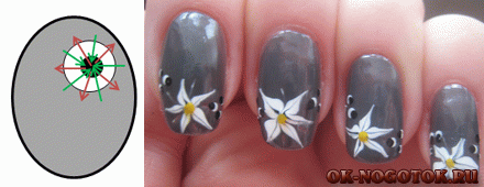 В углу ногтевой пластины кисточкой ставится точка, далее она окружается еще пятью точками по кругу. Для завершения рисунка иглой/булавкой сердцевина цветочка соединяется с лепестками тонкой линией, пока лак еще мокрый.