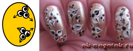 - На разных половинах тонкой кистью прорисовать веточки контрастными лаками. Высушить;