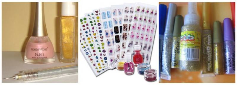 Что необходимо иметь для создания узоров? Лаки: прозрачный, лечебный, несколько цветов декоративных, блеск, фиксатор лака. Материалы – стикеры, шаблоны, наклейки для ногтей с готовым рисунком, блёстки, другие украшения, несколько иголок, тонкие кисточки. Акриловые краски пригодятся в дальнейшем.
