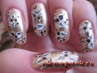 Фото урок рисунка на ногтях иголкой. Цветы на золотом фоне.