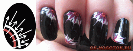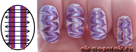 - Размытый рисунок (два контрастных цвета или светлый и тёмный тон одного). Поверх мокрого слоя кисточкой наносят узор (волны, круги, спираль) другим лаком. Зубочисткой корректируются погрешности.