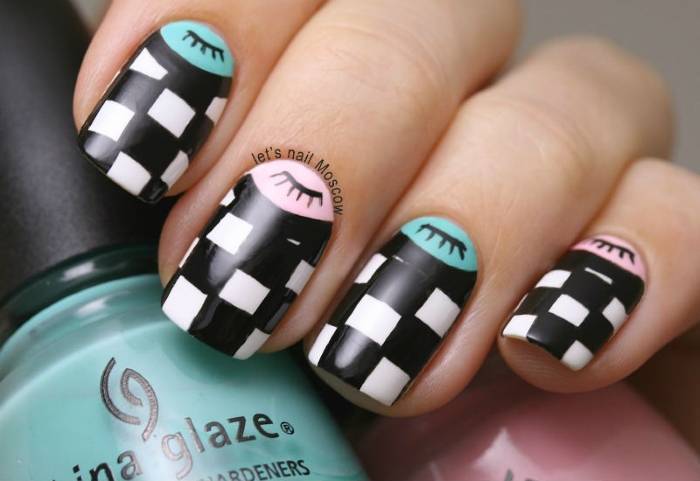 Маникюр, представленный на фото, является одним из самых легких вариантов исполнения рисунка со скотчем. Запаситесь белым, черным и прозрачным лаком для точного выполнения геометрического дизайна: