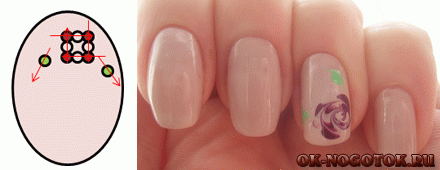 - Иголкой аккуратно проставить от цветочков в линию несколько точек красным лаком;