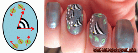 - в тренде сделать такого типа рисунок на одном ногте, остальные раскрасить или оформить как-то иначе;