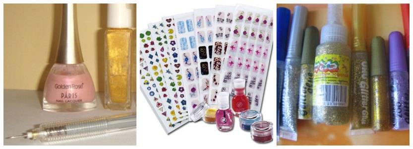 Что необходимо иметь для создания узоров? Лаки: прозрачный, лечебный, несколько цветов декоративных, блеск, фиксатор лака. Материалы – стикеры, шаблоны, наклейки для ногтей с готовым рисунком, блёстки, другие украшения, несколько иголок, тонкие кисточки. Акриловые краски пригодятся в дальнейшем.