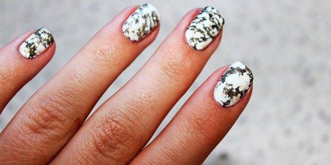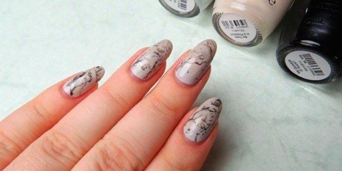 Существует способ выполнения маникюра и для людей, ограниченных во времени. Некоторые производители впускают лаки, в которых смешаны сразу несколько оттенков или добавлены цветные вкрапления. Покрытие имитирует эффект мрамора. К достоинствам относится то, что такой лак легко и быстро наносить. Для этого не нужно особой практики или временных затрат, как в случае с выполнением маникюра на воде, кистью или пленкой. Минус – цена мраморных лаков бывает высоковата.