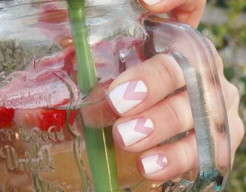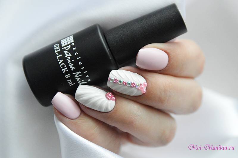 Следующий дизайн привлек наше внимание тем, что в нем естественный розовый оттенок ногтя гармонично сочетается с молочно-белым матовым покрытием. Делается маникюр легко и быстро