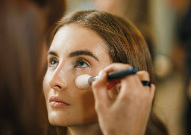 - нанесите рассыпчатую пудру и равномерно распределите ее по лицу с помощью широкой кисточки.