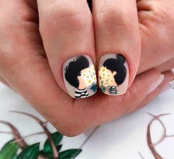 Креативная новинка маникюра на лето 2024 – дизайн с влюбленной парочкой, что будет идеален для романтических натур. Рисунки лучше всего создать на больших пальчиках, остальные покрыв приятным нюдовым цветом, что будет смотреться модно и очень оригинально на коротких ноготках этим летом.