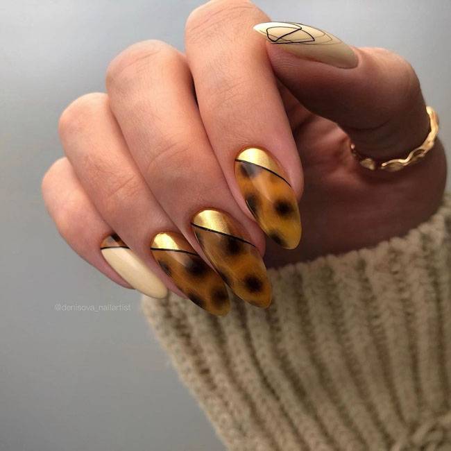 Золотые элементы будут хорошо сочетаться с абстрактными рисунками, а также с нейл-артом на зимнюю тематику.️️