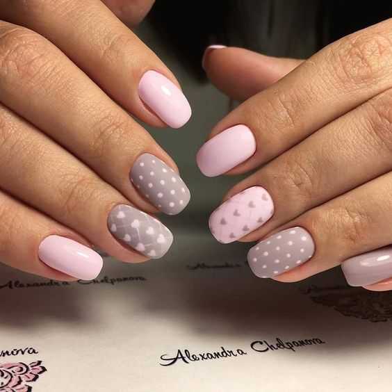 Серый тон выбирают не так часто, однако он отлично смотрится именно в качестве базы. Комбинировать его стоит с розовым, желтым, белым или синим. Несмотря на то, какие оттенки вы выберете, общий характер маникюра будет зависеть от их насыщенности. К примеру, выбирая пастельную цветовую гамму, вы получите милый, нежный дизайн.