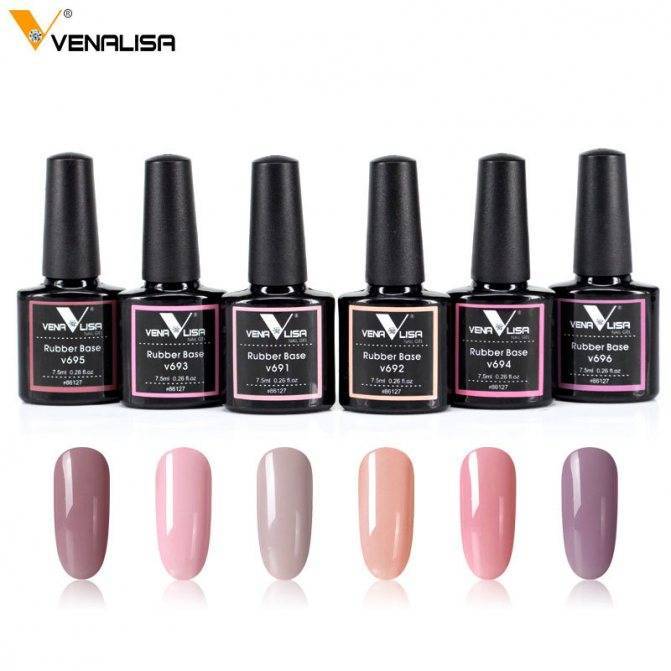 Одной из первых начала изготавливать подобные изделия компания VenaLisa. Действительно бренд предлагает огромное количество цветовых оттенков, включая черный и белый, а также всевозможные варианты нюда. При этом многие мастера маникюра уже оценили данный бренд. Покупатели отмечают, что база достаточно жидкая, ей очень сложно выполнить выравнивание. Подходит лишь для втирающего внесения тонким слоем. Многие отметили, что при выравнивании, а также нанесении базы методом капли, она деформируется, а внутренняя часть не просыхает. То есть верхняя часть берется коркой, при этом внутренняя часть средства остается жидкой. Такой маникюр очень быстро слазит с ногтя тонкой пленкой. Но многие девушки нашли выход, наносят камуфлирующую базу в несколько тонких слоев, выслушивая в очень мощной лампе на 48 Вт.