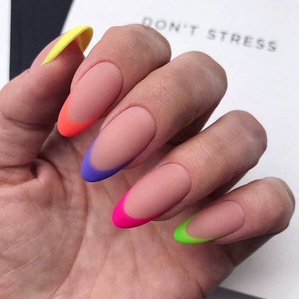Неоновые и кислотные оттенки ногтей на лето будут самыми популярными и востребованными, позволяя создать супермодный летний маникюр в стиле френч, омбре, с цветами и полосками, негативным пространством и непременно с матовым топом.