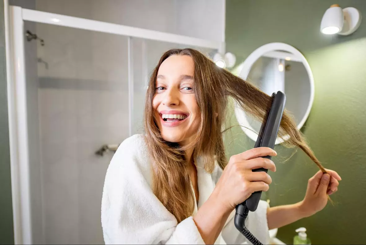 Распределяем термозащитное средство, прогреваем стайлер до необходимой температуры и поочередно зажимаем пряди между пластинами, периодически поворачивая устройство в разные стороны. Следим за тем, чтобы каждый участок находился в горячей зоне не более 5 с. В противном случае образуется деструктивный перегрев, который ухудшит и без того плачевную ситуацию.