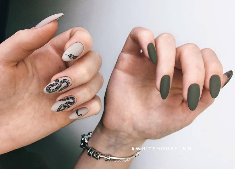 Что касается формы ногтей, змеиный дизайн универсален. Принт можно создать как на овальных, так и на квадратных ноготках. Рисунок змейки красиво сочетается с формой миндаль и заостренными ноготками.