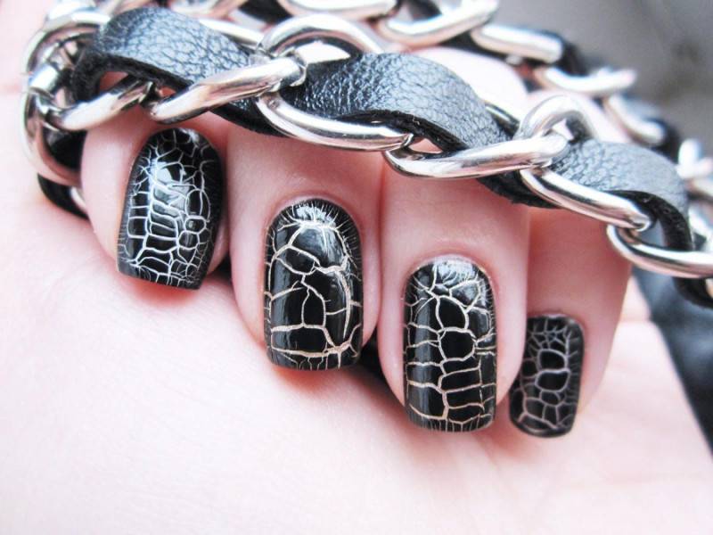Есть один из самых простых способов создания дизайна ногтей с видом змеиной чешуи с помощью техники кракелюра. Для этого берут лак со специальным эффектом растрескивания и наносят на ногтевую пластину.