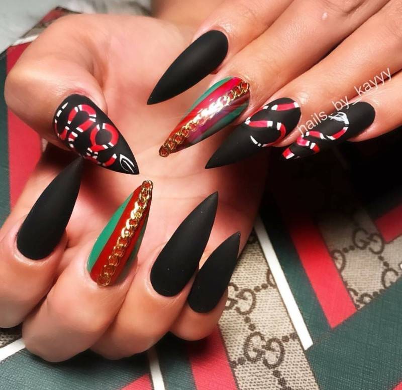 Также на длинных ногтях очень важно выполнить модный и стильный дизайн в стиле Gucci