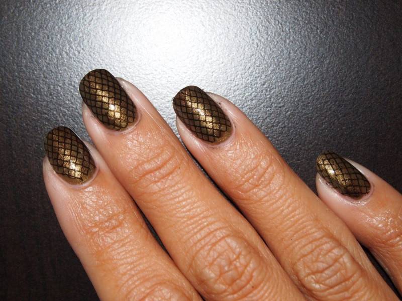 - Затем нанесите темный лак поверх сетки. Это может быть не обязательно черный. Ведь Вы имитируете кожу змеи. Можно взять насыщенно темно-зеленый лак, темно-синий, серый, коричневый или бордо. Лак, который наносите поверх сетки, промачивайте спонжем. Как только лак высохнет, аккуратно снимайте сетку. Ноготь готов! Все остальные делаем, как первый. После чего закрепляем маникюр специальным закрепителем для ногтей.