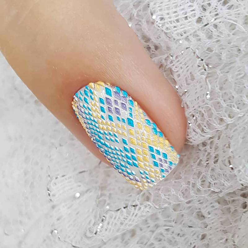 - Чтобы эффект был более выраженным, нужно придать объемности рисунку. Для этого мы будет использовать густое топовое покрытие и дотс для ногтей. В центр каждой ячейки сеточки поставьте по объемной точке. Сразу просушите в лампе, чтобы база не растекалась.