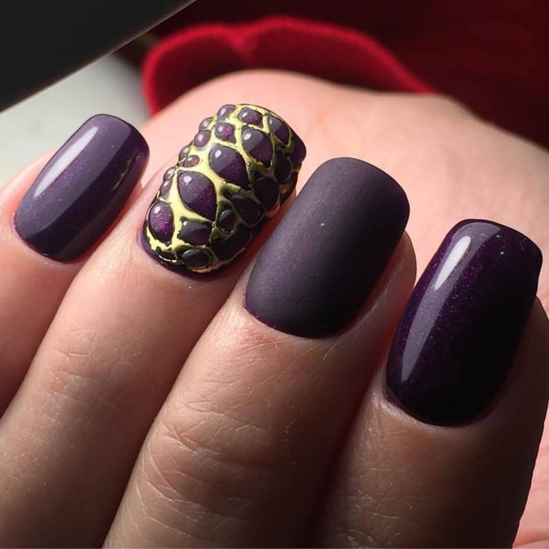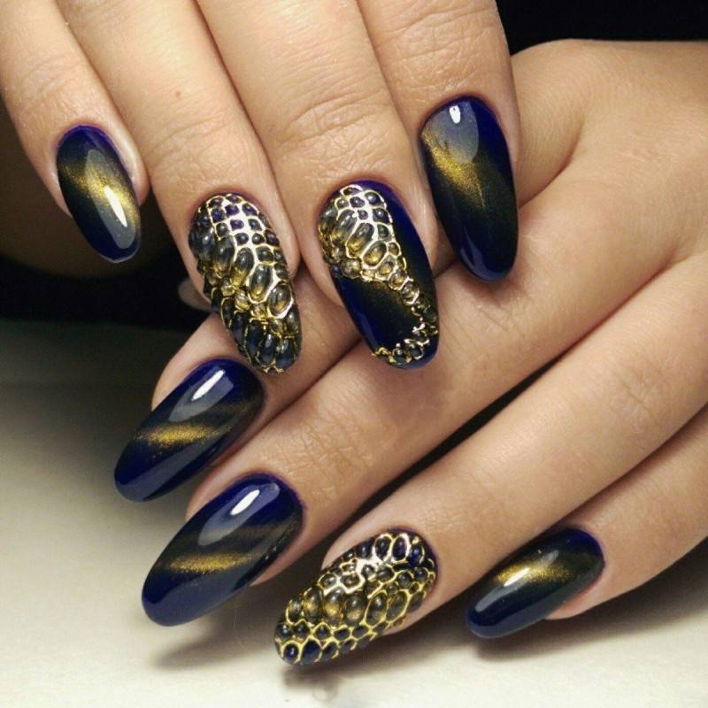 Очень эффектно смотрится на длинных ногтях объемный рисунок, имитирующий кожу рептилии. Красивые весы наносятся гель-лаком или раскрашиваются акриловой краской разных оттенков