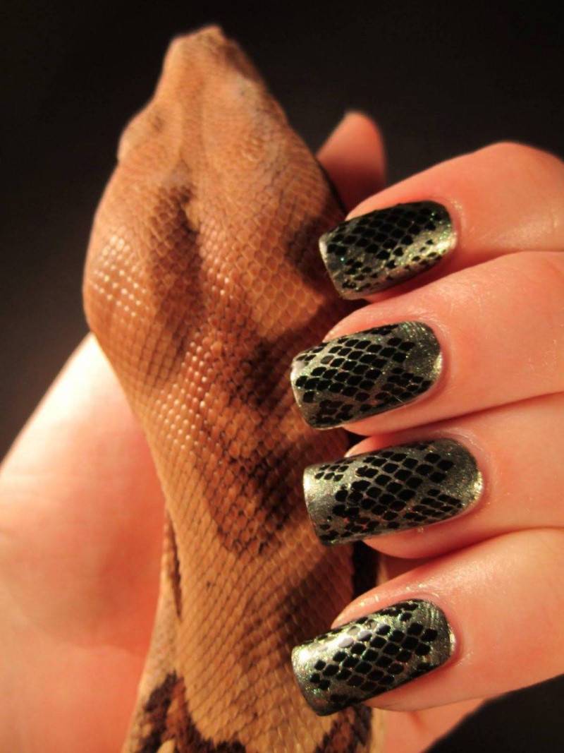 Благодаря современным материалам мастера маникюра имеют возможность создавать на ногтях просто настоящие произведения искусства, и без особого труда выполнять дизайн, максимально имитирующий кожу рептилий. Для таких целей используется ряд готовых наклеек, стемпинг, элементы из фольги, губки и сетки. С помощью акрилового, гелевого или кракелюрного лака можно украсить ногти «настоящими» объемными чешуйками. А фишкой в змеином маникюре стал недавно появившийся метод украшения ногтевых пластин натуральной кожей этих существ, от которой они избавляются во время сезонной линьки. Кусочки натурального материала крепятся к ногтевым пластинам и фиксируются сверху прозрачным гель-лаком. Уникальный эффект естественности готов!
